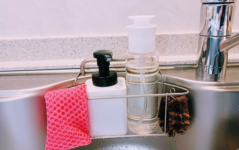 我が家のキッチンは、シンクの洗剤&スポンジを入れるコーナーが小さい(幅が狭い)ので、大きな容器が入らないんです。